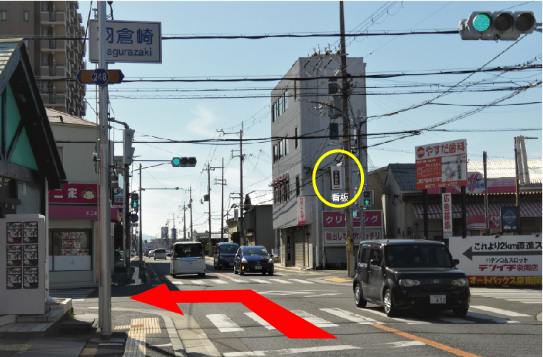 府道63号線(旧26号線)を大阪方面よりお越しの方は羽倉崎交差点を左折、羽倉崎駅までお越しいただくとすぐです。